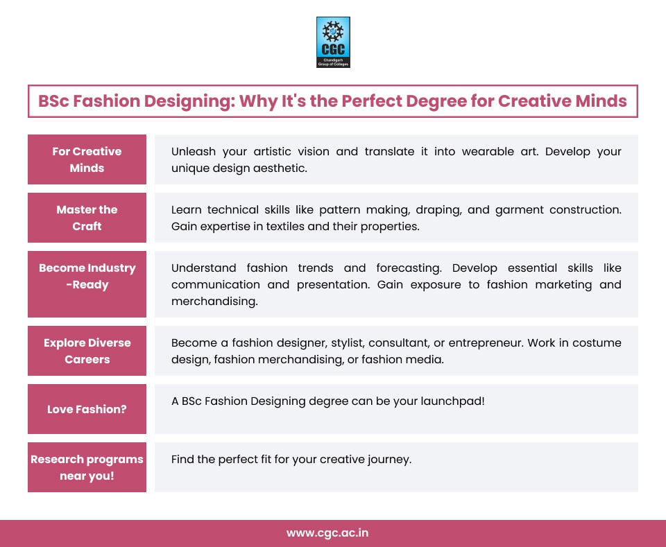 So, if you're ready to turn your passion for fashion into a fulfilling profession, don't wait any longer. Consider CGC Jhanjeri's BSc Fashion Designing program and embark on a journey that will allow you to express yourself, shape trends, and leave your mark on the world of fashion. We can't wait to see your creativity blossom!